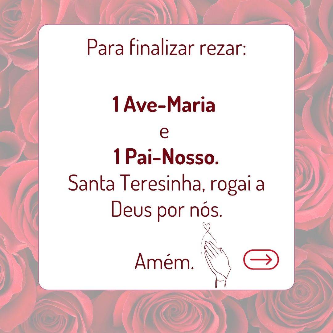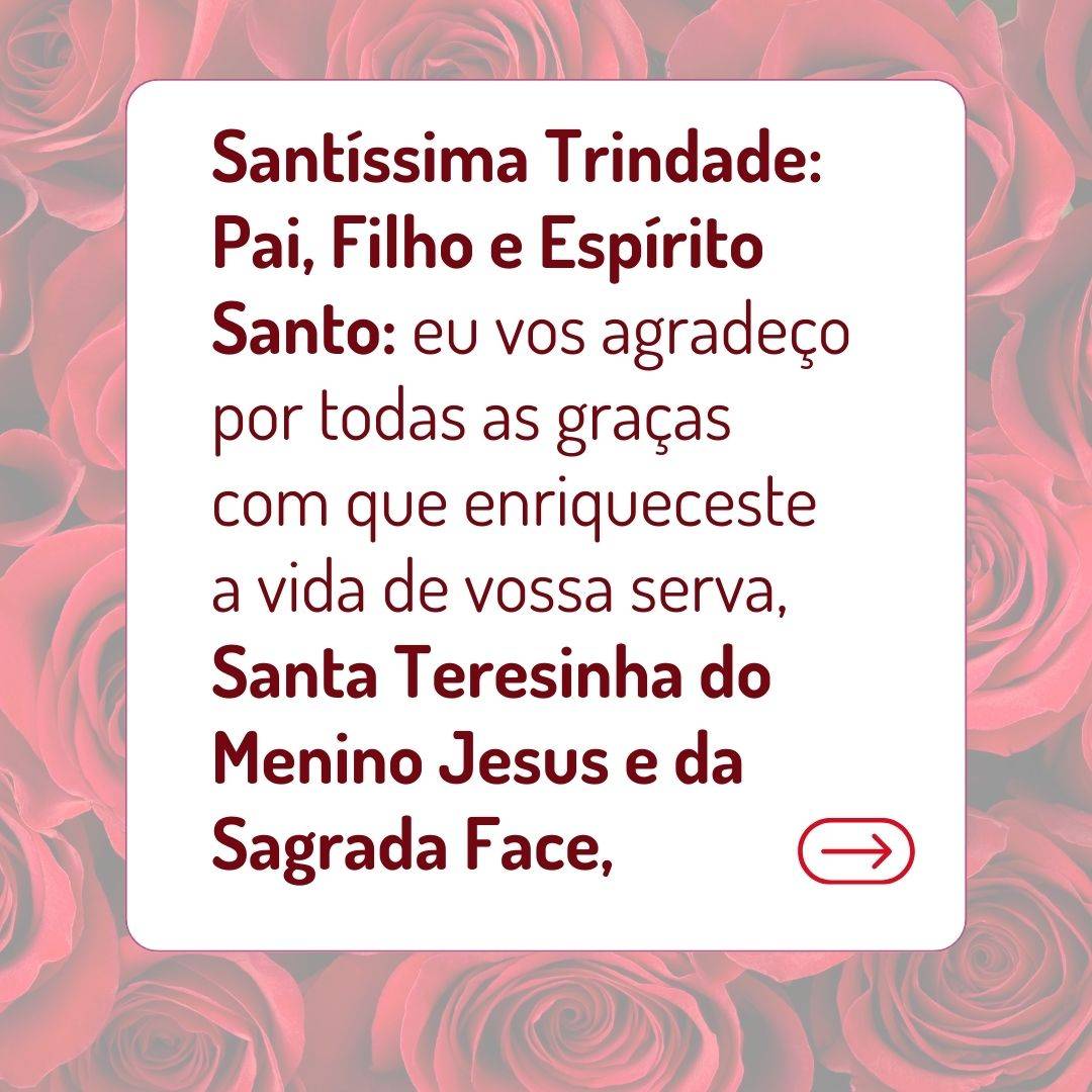 Santíssima Trindade: Pai, Filho e Espírito Santo: eu vos agradeço por todas as graças com que enriqueceste a vida de vossa serva, Santa Terezinha do Menino Jesus e da Sagrada Face, nestes 24 anos que passou na terra. E pelos méritos de tão querida santinha, concedei-me a graça que ardentemente vos peço … (faça aqui o pedido), se for conforme a Vossa Santíssima Vontade e para a salvação de minha alma (ou da pessoa por quem está rezando).