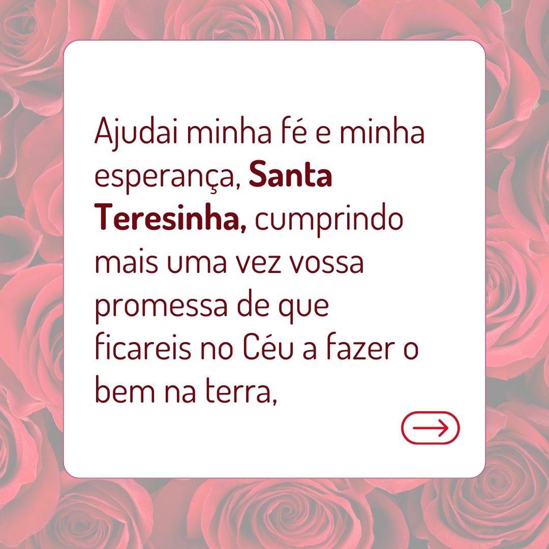 Ajudai minha fé e minha esperança, Santa Terezinha, cumprindo mais uma vez vossa promessa de que ficareis no Céu a fazer o bem na terra, permitindo que eu ganhe um rosa em sinal de que alcançarei a graça pedida.