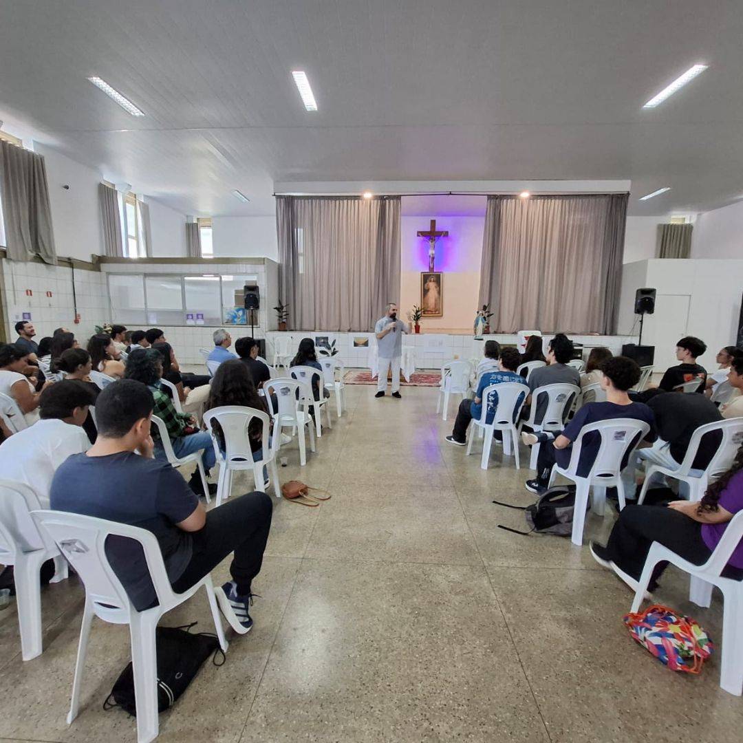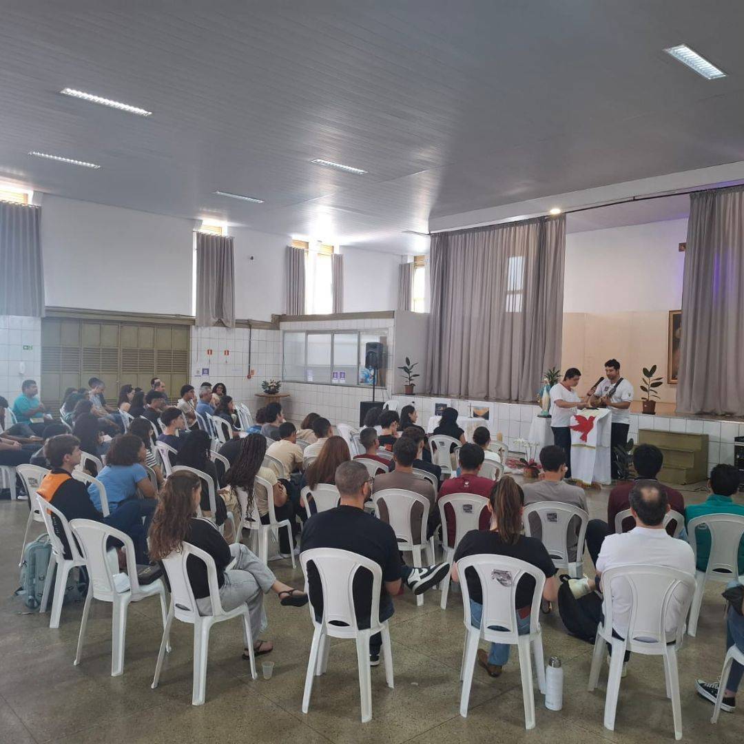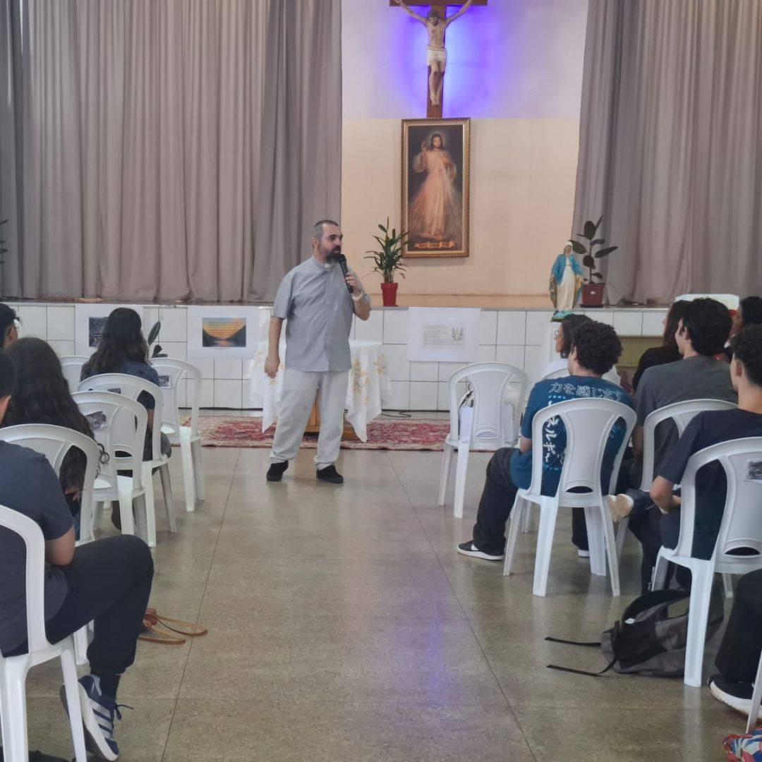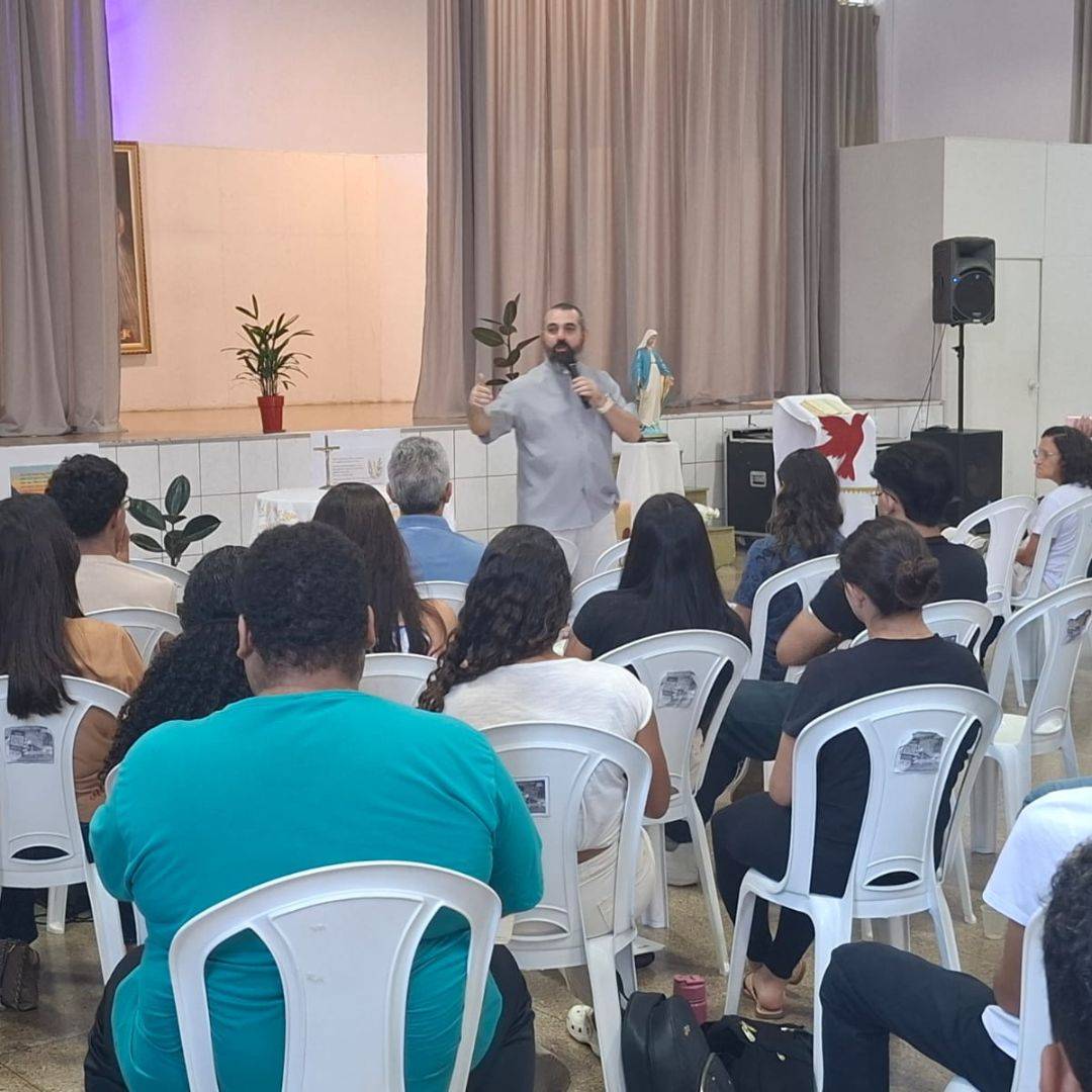 O encontro foi marcado pela convivência com os catequistas e pela presença do Pe. Eli Marcel, que acompanhou o grupo em conversas e no momento central de Adoração ao Santíssimo Sacramento.